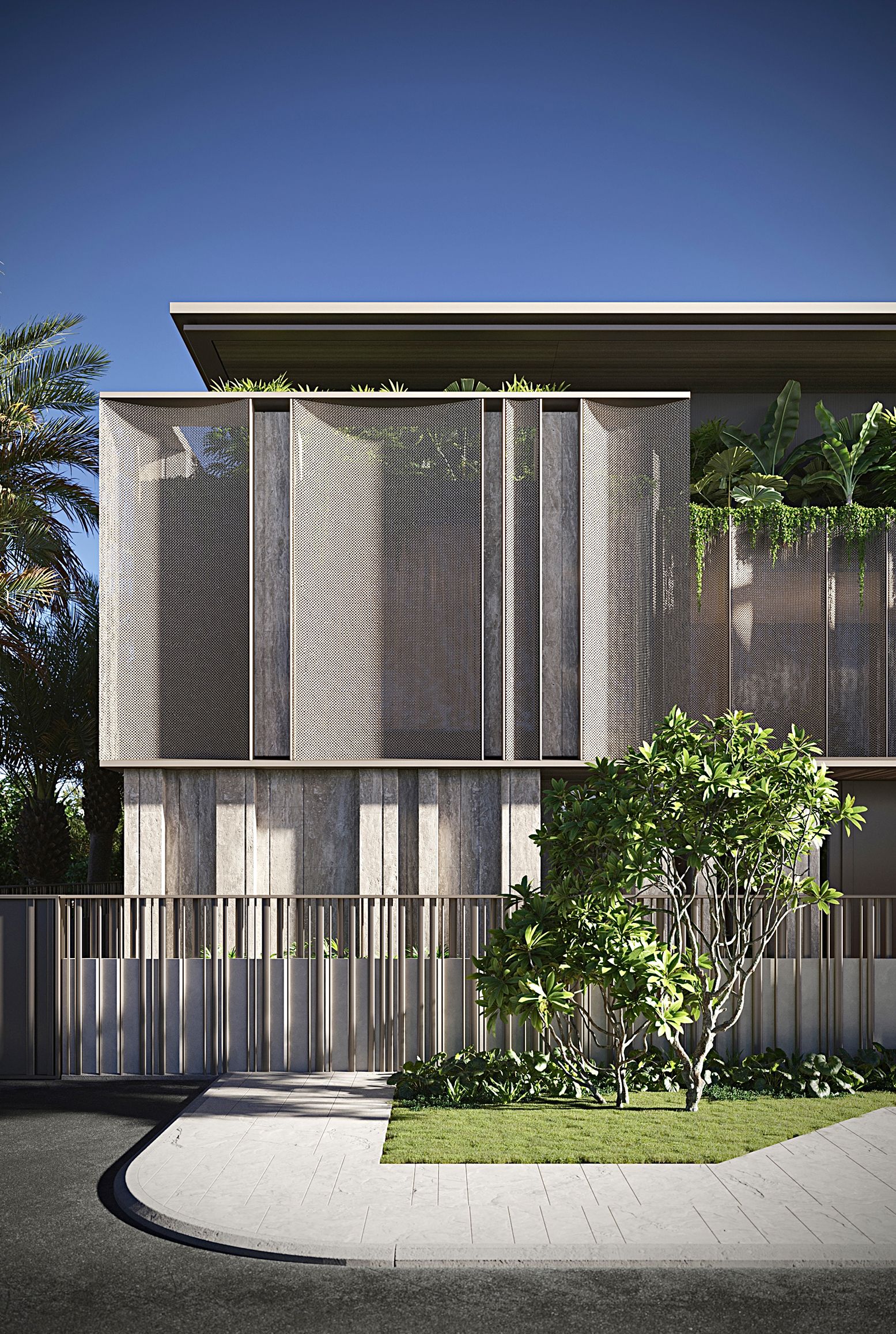 The architectural team focused on bold yet harmonious solutions, using terracotta plaster for the facade to bring warmth and vibrancy. Travertine accents on the plinth and natural stone masonry highlight the guest house and recessed areas. To enhance the main entrance, we incorporated a canopy and crafted artistic pathways leading to the entryway, alongside strategically placed fire features that add movement and visual appeal.