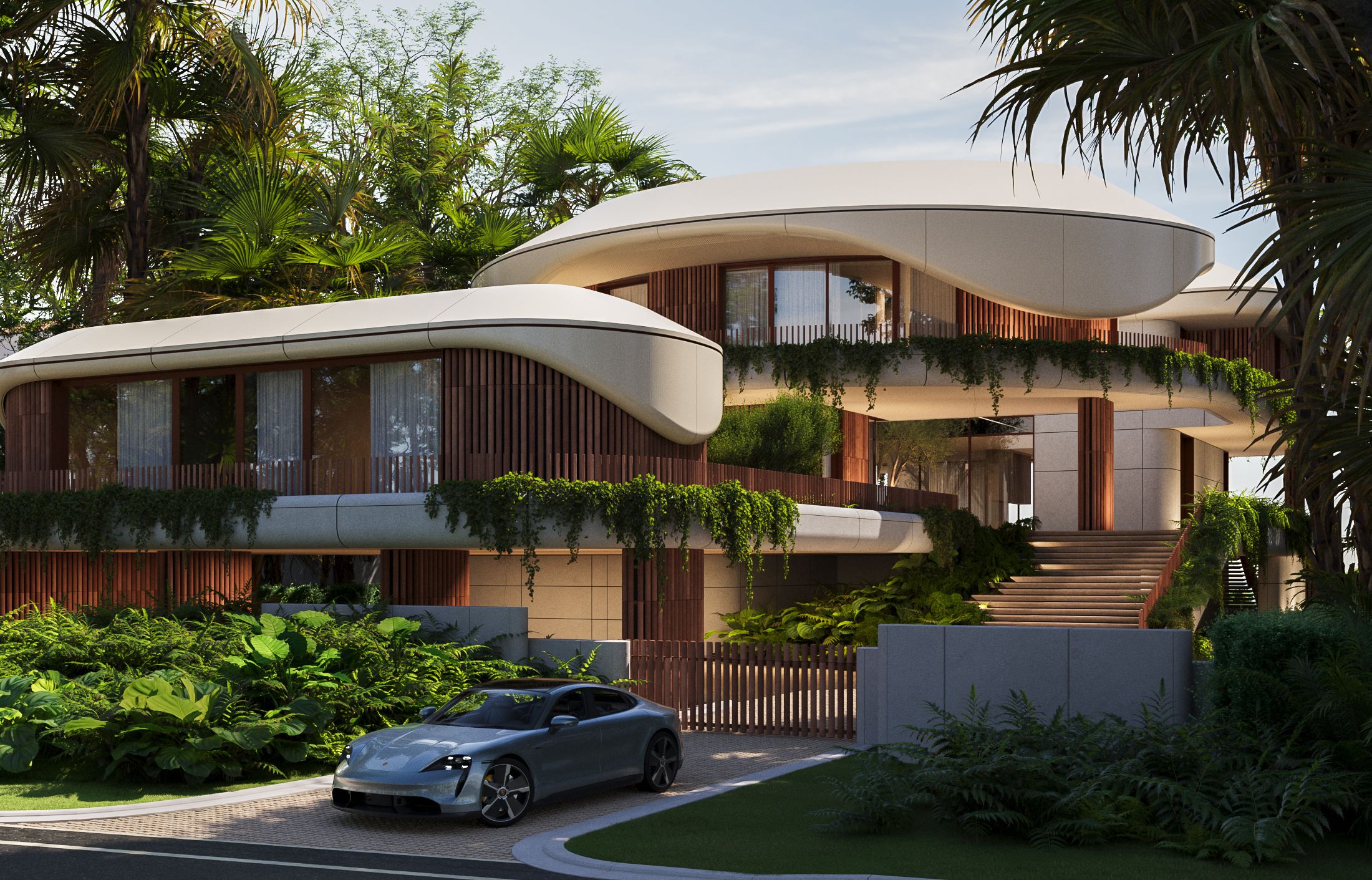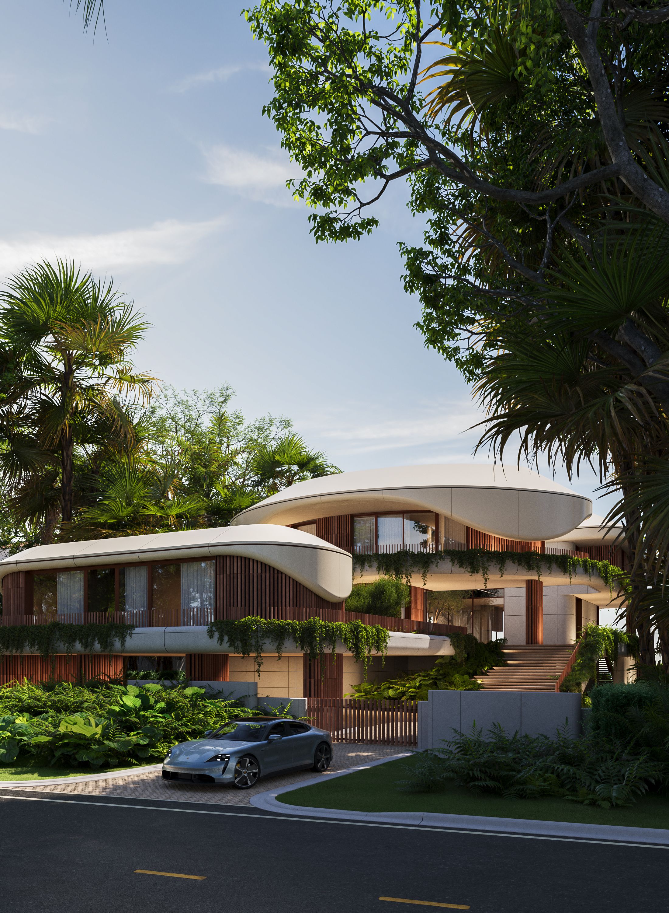 Slender vertical columns add movement and structure to the facade, while a refined ceramic cornice lends it lightness and balance. A glass pool wall filters daylight into the wellness area below — home to a spa and gym — while lush terraces and integrated greenery bring calm, creating an intimate dialogue with the surrounding nature.