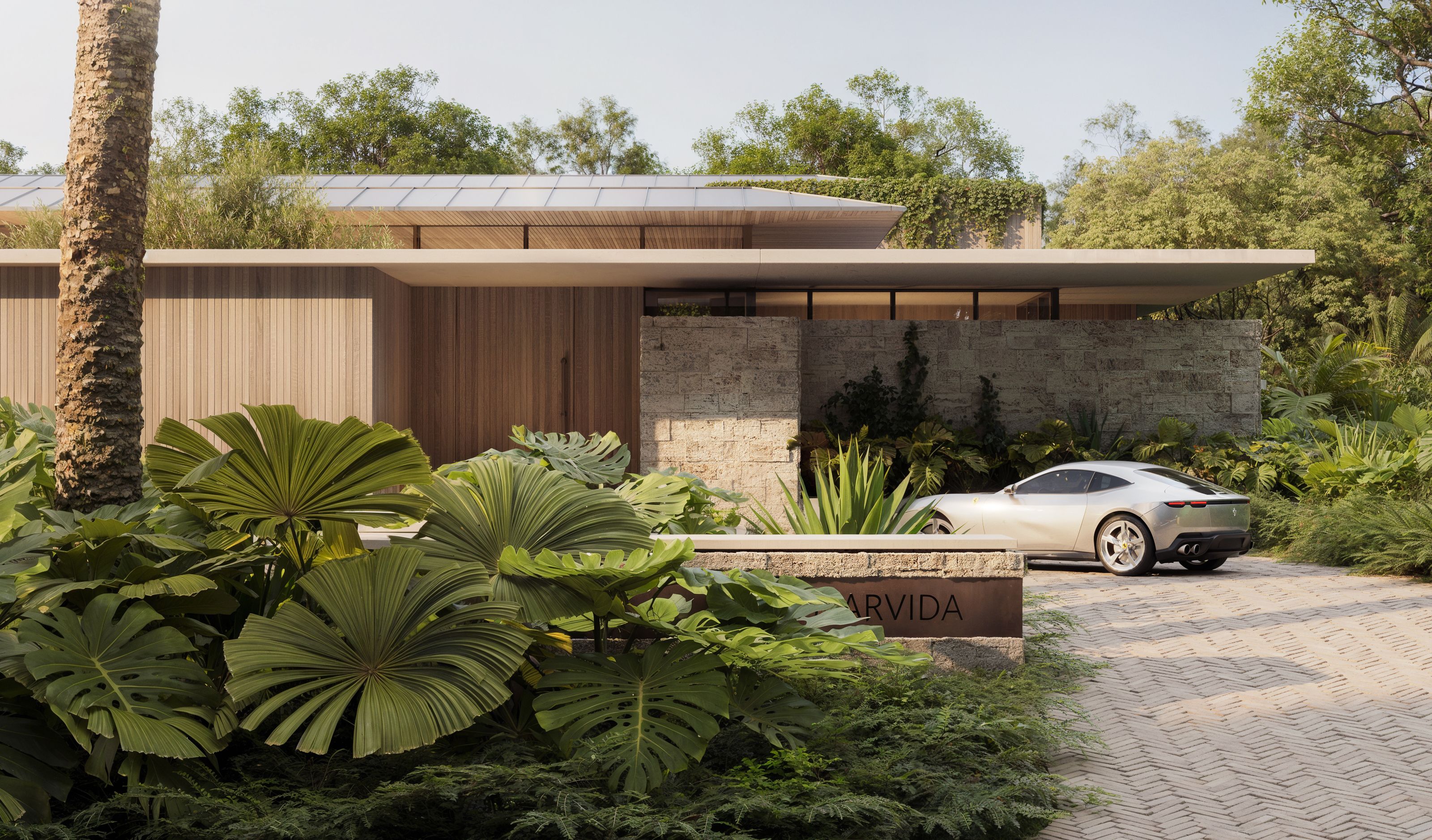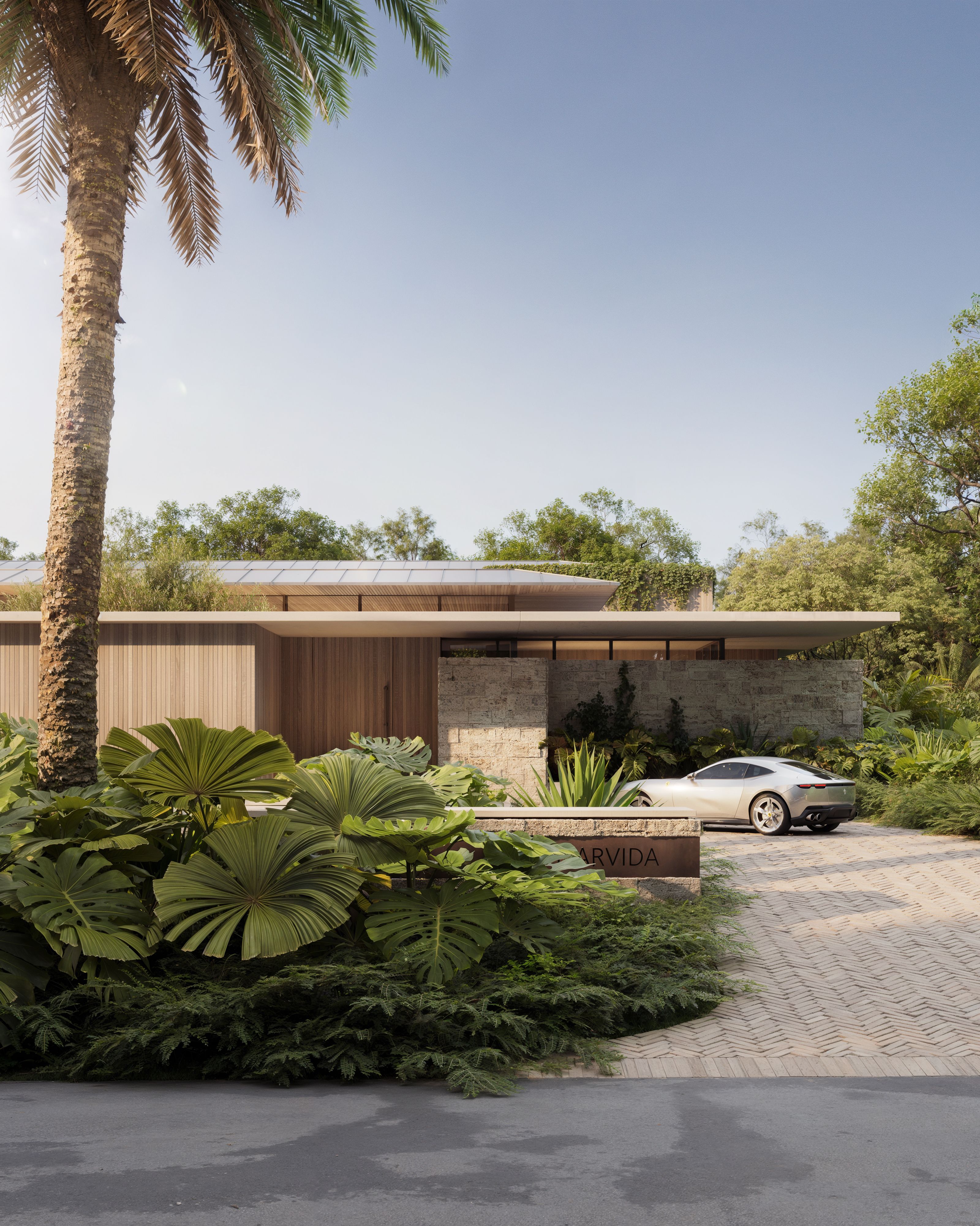 The architectural concept of the villa is deeply influenced by the unique topography of the site, where the building form follows the natural contours of the steep terrain.