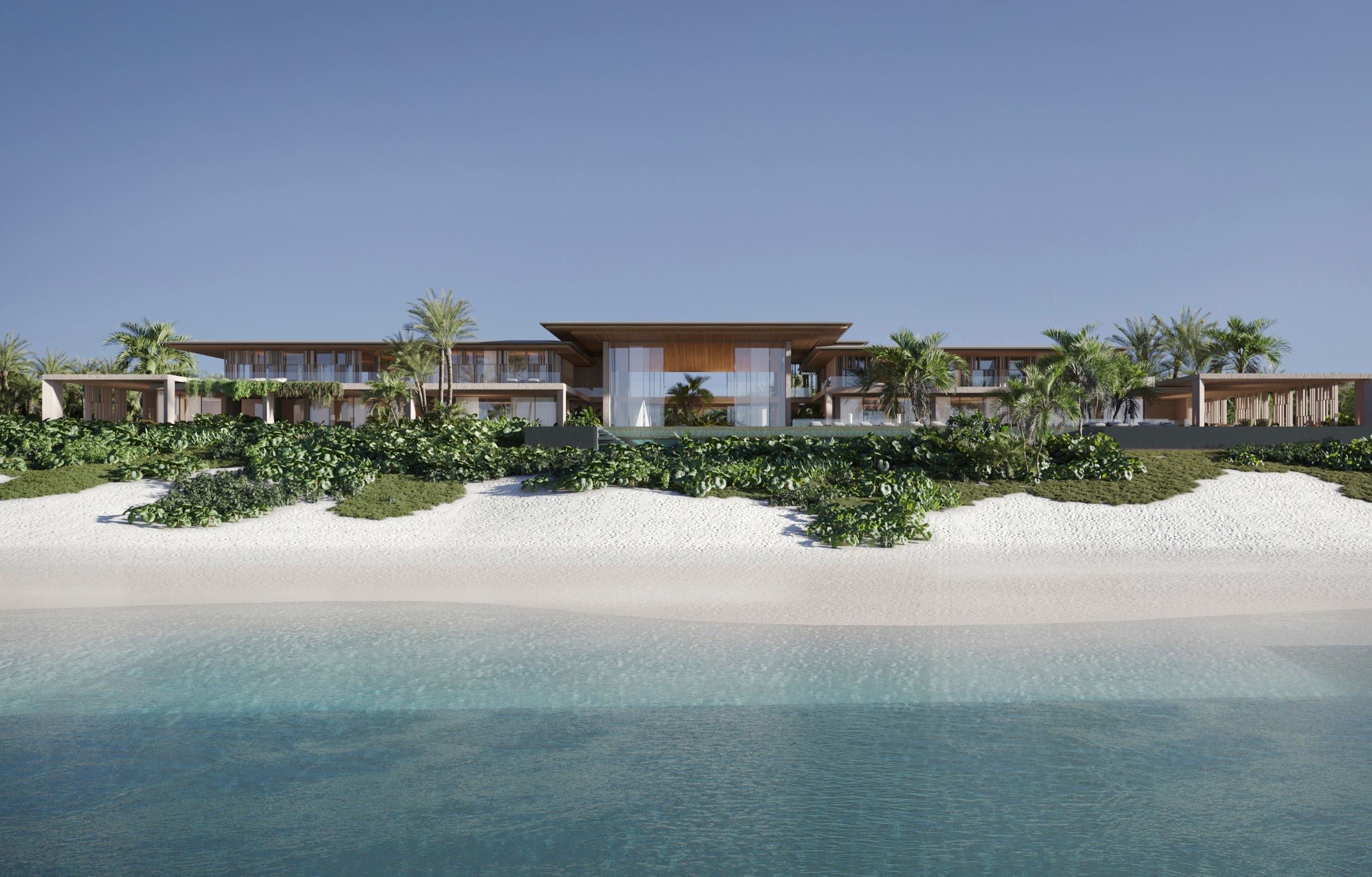 They don’t just add vertical rhythm and grandeur but cleverly hide automated hurricane shutters, offering protection without compromising the home’s sleek lines.