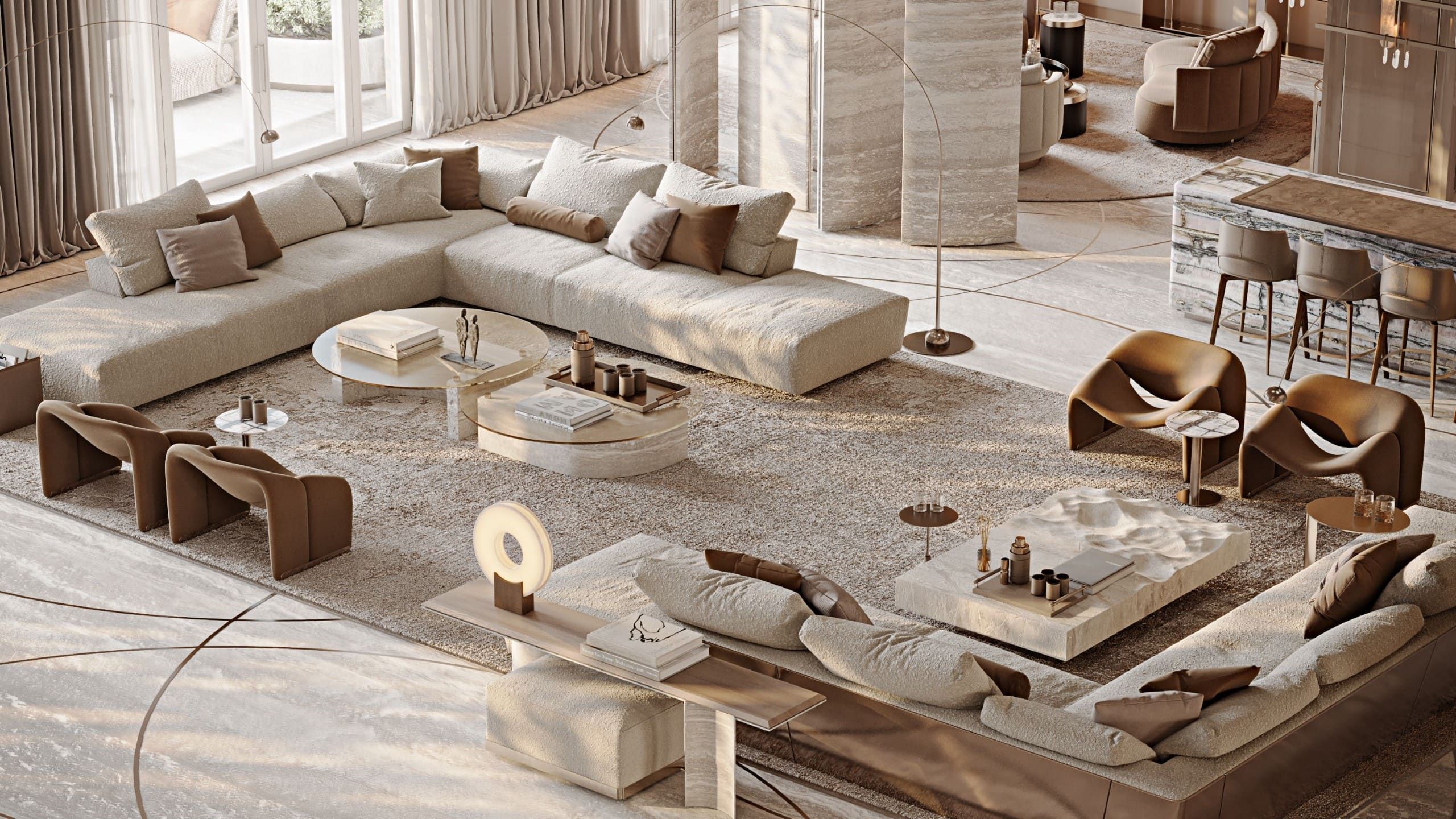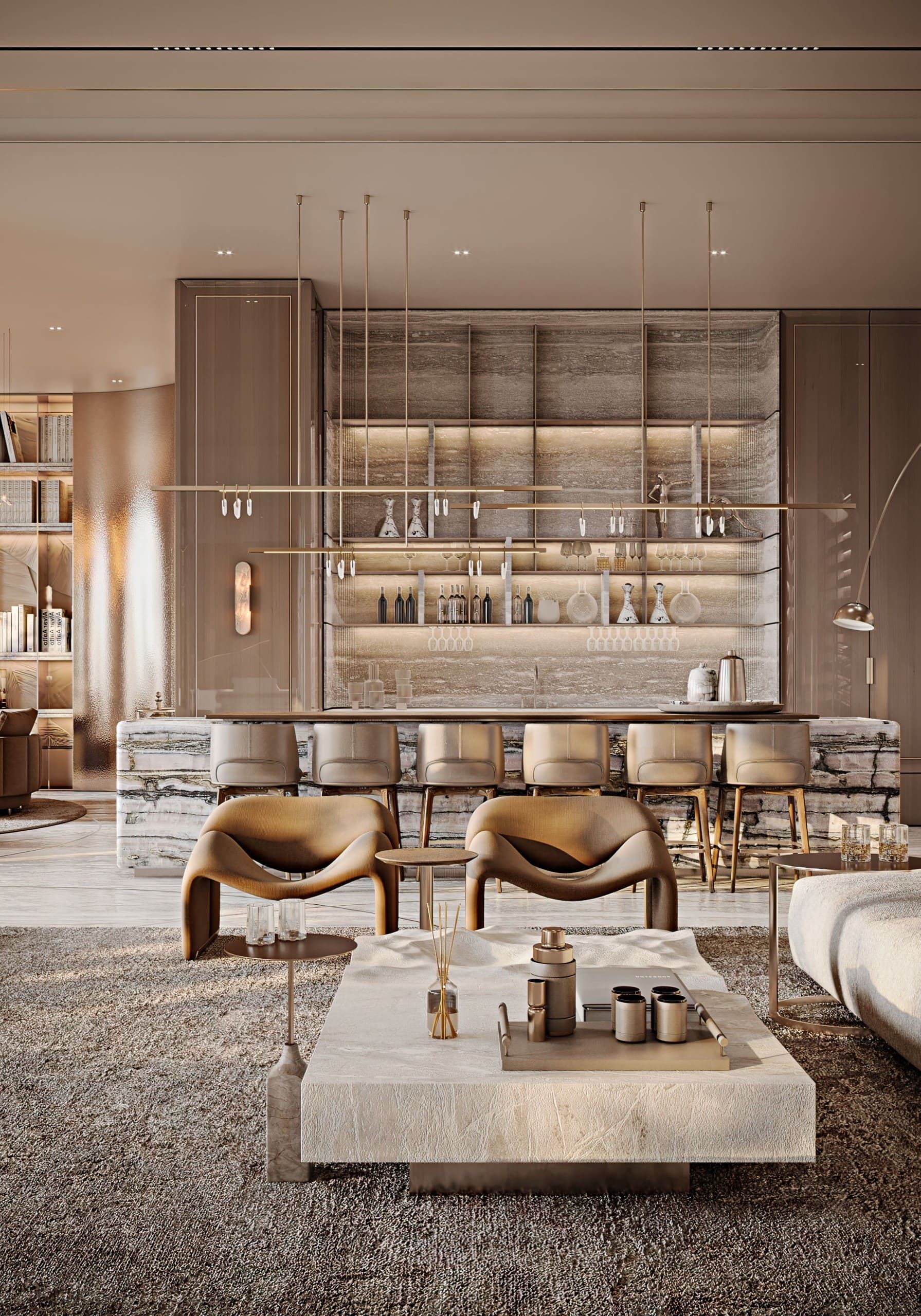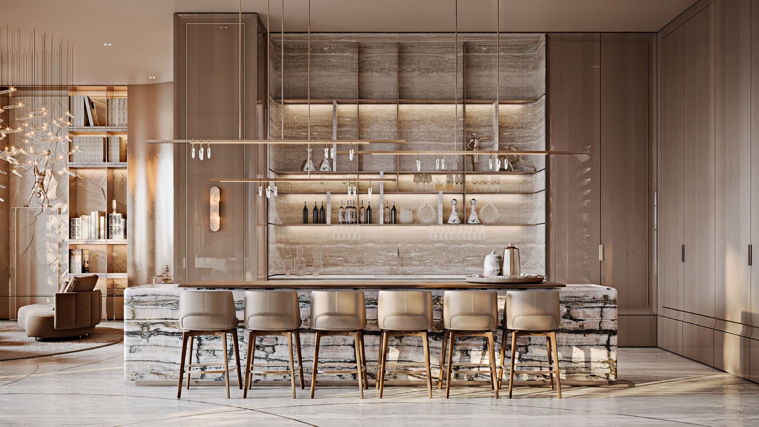The design embraces travertine, onyx, and brass to evoke timeless luxury, while lacquered oak veneer and leather introduce warmth and tactile richness. Refined moldings frame each space, uniting natural textures with crafted details in a contemporary composition.