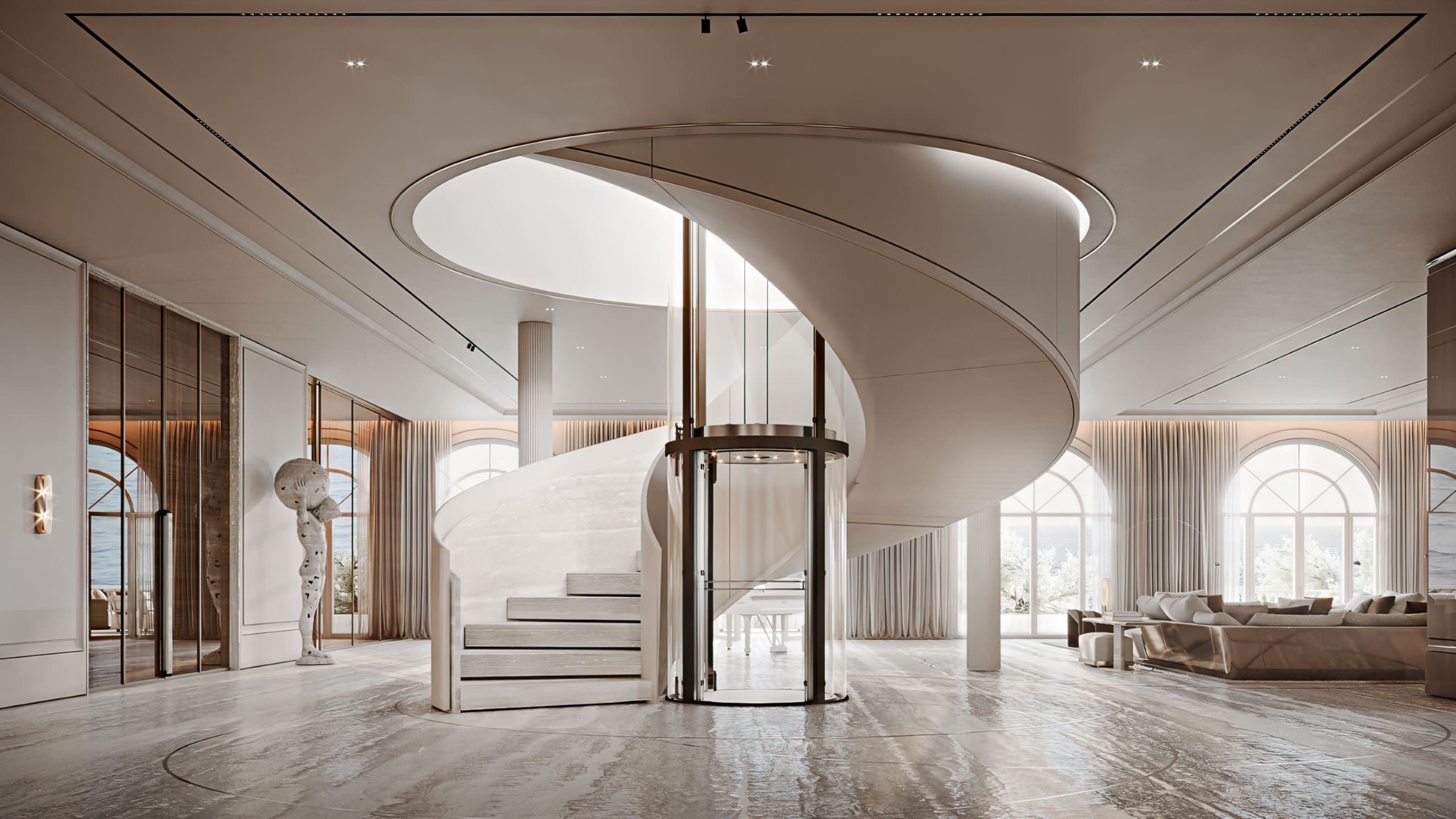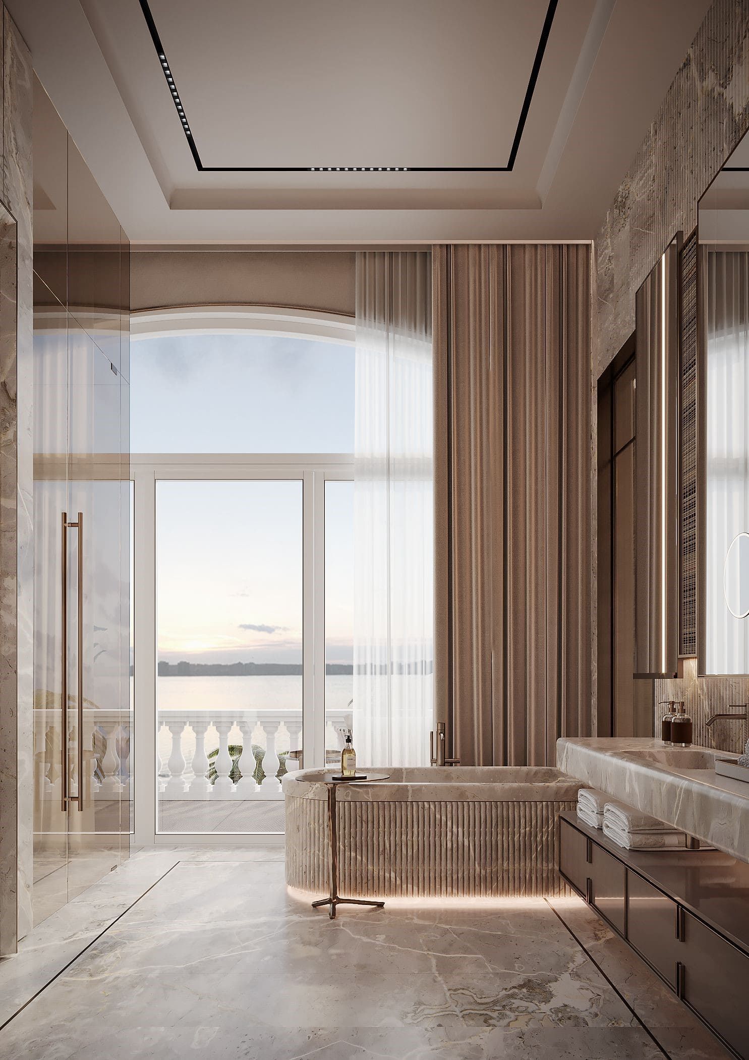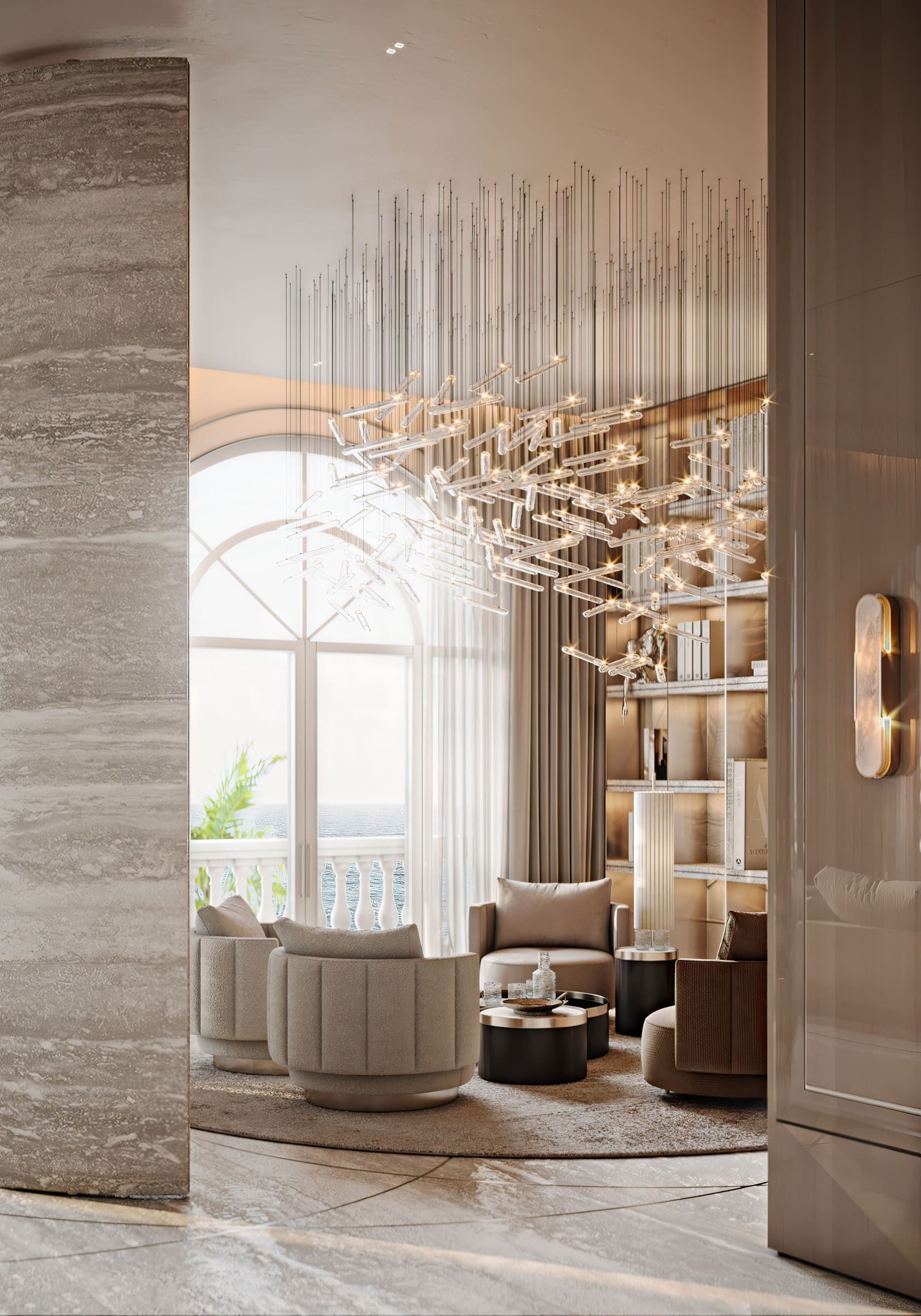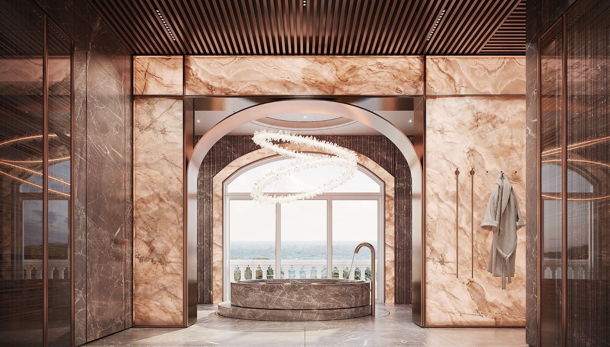 The design embraces travertine, onyx, and brass to evoke timeless luxury, while lacquered oak veneer and leather introduce warmth and tactile richness. Refined moldings frame each space, uniting natural textures with crafted details in a contemporary composition.