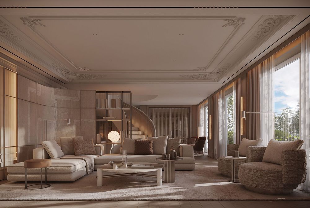 YODEZEEN's design integrates opulent materials and architectural motifs, such as brass-rounded panels inspired by the domes of Raffles The Palm. The use of classic moldings and bas-reliefs ties the interior to the timeless architectural features, while rounded forms in the staircase and seating areas echo the building's iconic design.
