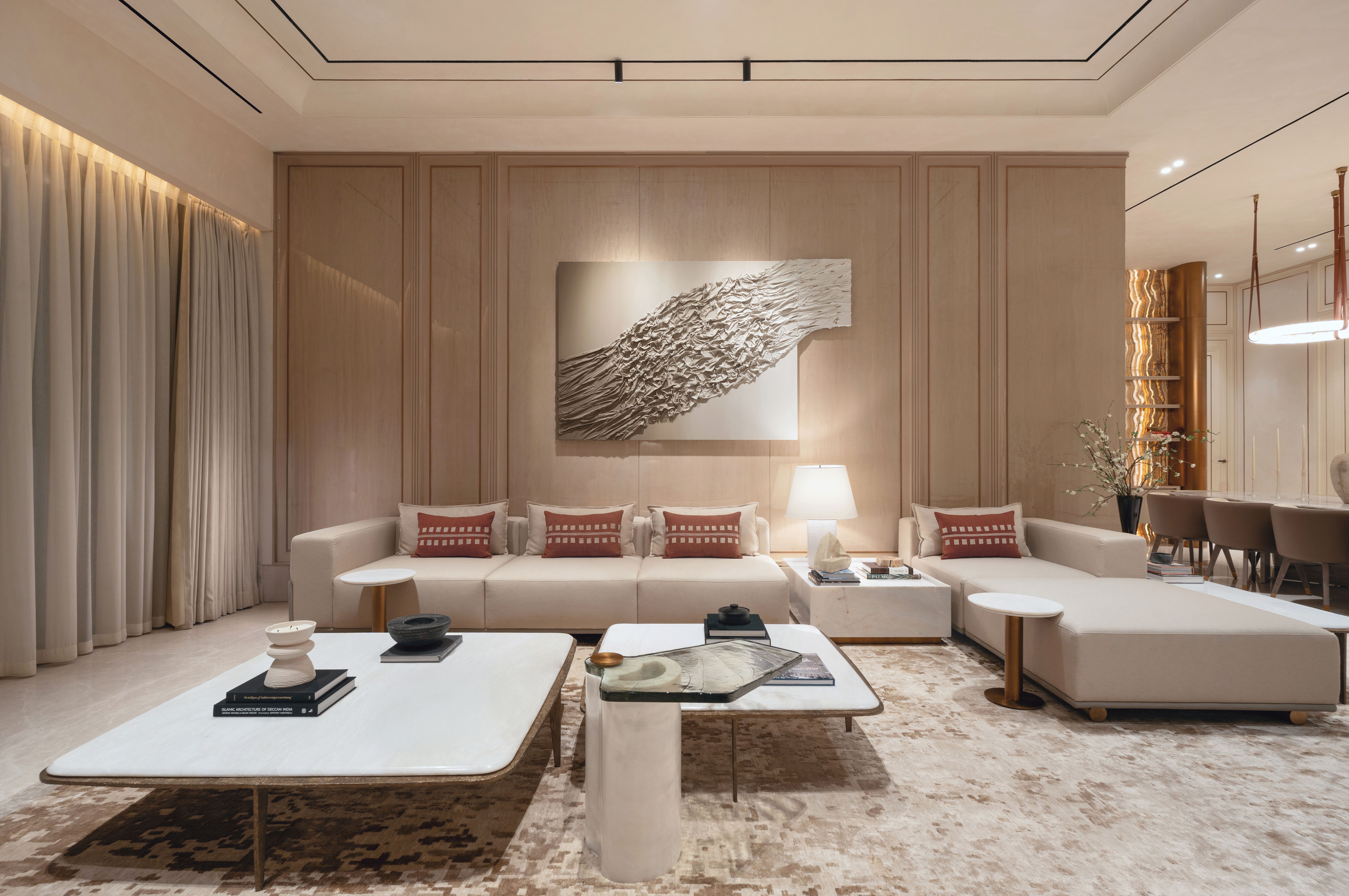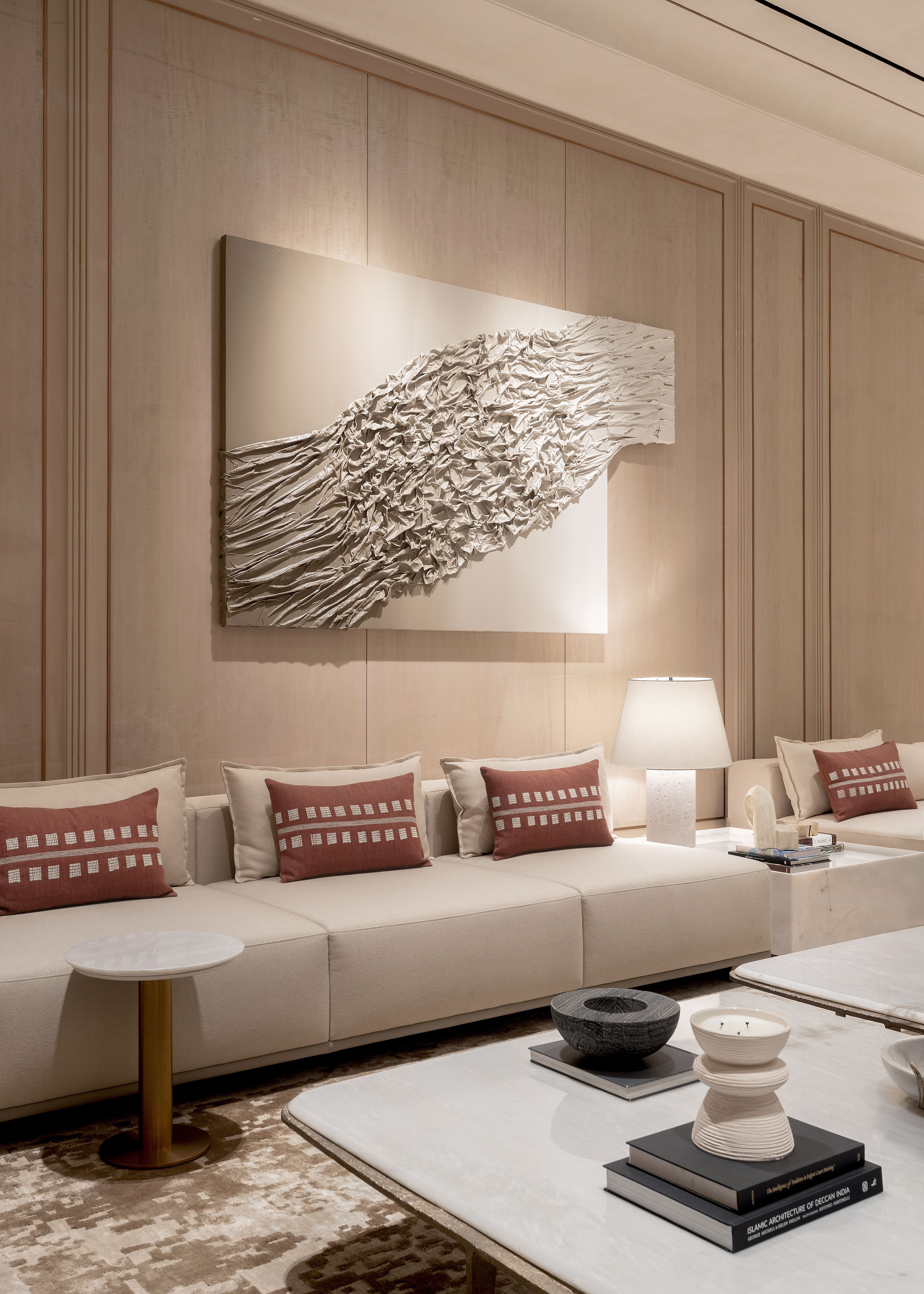 The apartment is designed in a calm and discreet YODEZEEN style. The interior is filled with lots of travertine and wood paneling, and a large amount of greenery draws the special comfort.